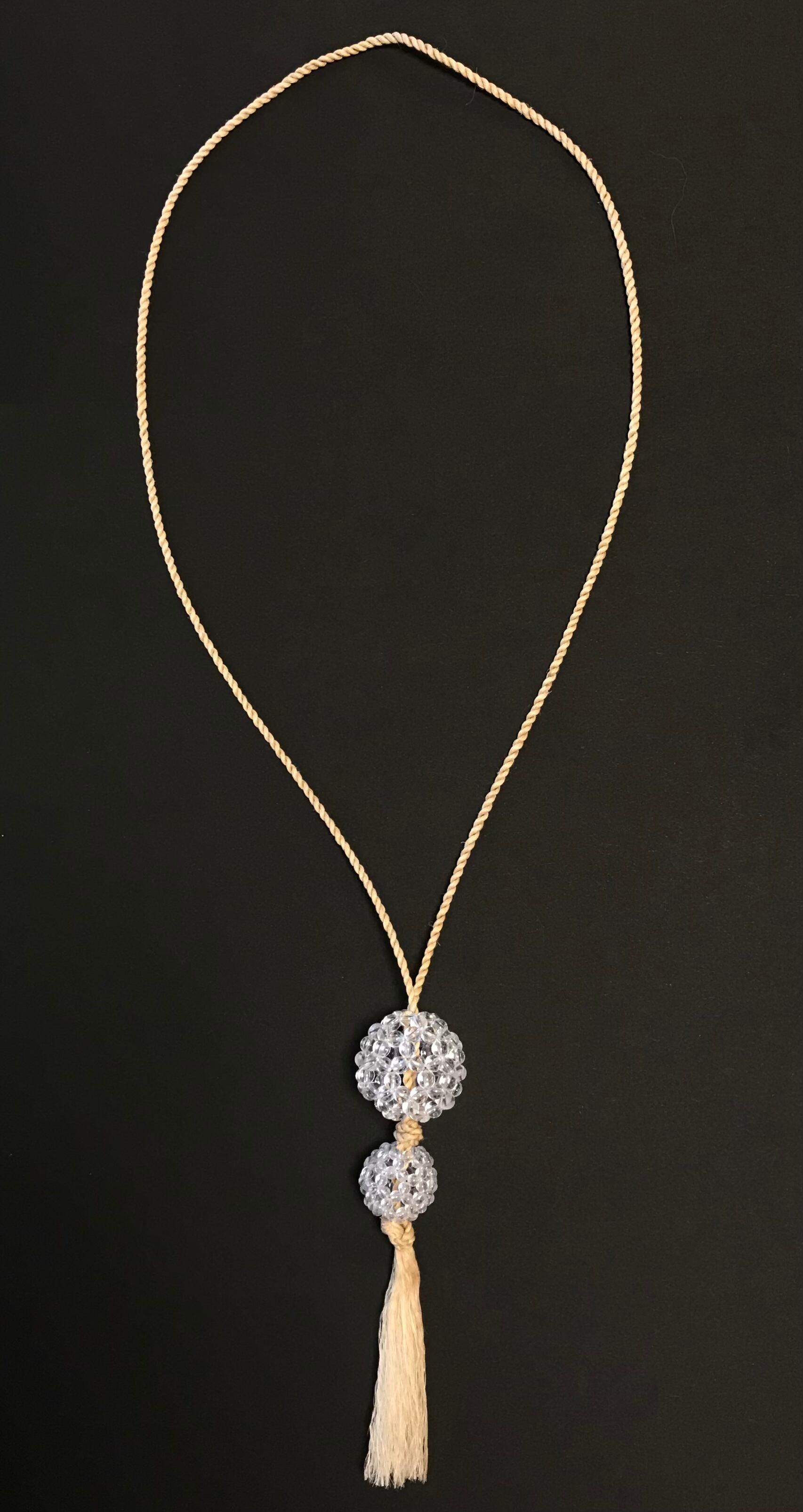 AAAランクの水晶4mm珠と3mm珠のダブル・フラーレンに精麻(国産野州麻)で編んだ紐を通してペンダント/ネックレスにしました。